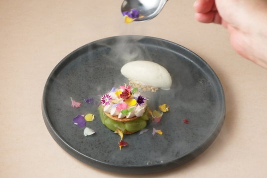 デセールには、エディブルフラワーをふんだんにあしらった華やかな一品を。