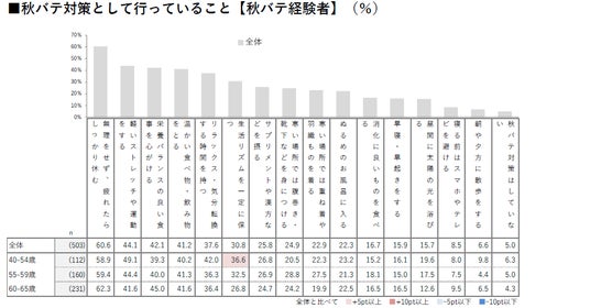 - 全国の40~65歳女性の62%が「秋バテを経験したことがある」と回答。特に40~54歳では全体平均を大きく上回り、72%にのぼる。