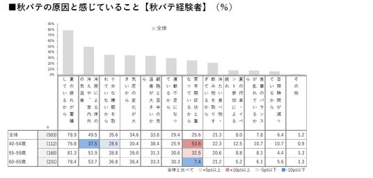 - 秋バテの原因は「夏の疲れが蓄積しているから」(79%)が最も多く挙げられた。次いで、「冷房による体の冷えや、室内外の気温差」(50%)が続き、特に55歳以上で高い。