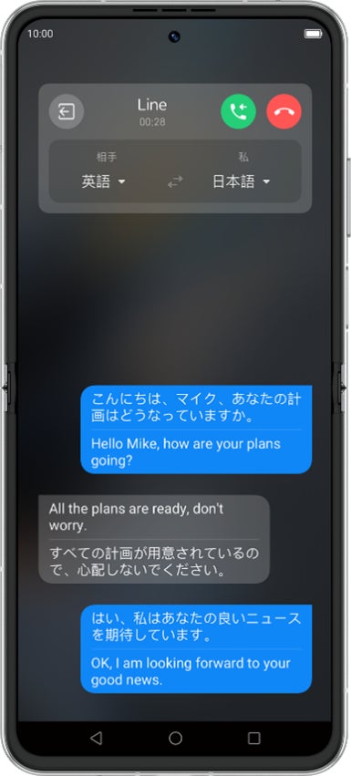 AI翻訳は電話アプリで通話中に同時通訳ができる機能です。通話画面でAI翻訳設定をすると、リアルタイム通話の翻訳画面が表示されます。通話と同時に音声が通訳され、テキストでも表示することができます。