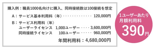 基本料金、ツール利用料の各種ライセンス、その他必要に応じてオプションを購入する価格体系です。同時接続プランにより、大規模なユーザー数でも利用実態に合った環境で運用ができます。全ユーザー常時利用を前提としたライセンス体系と比較しても導入・運用費用を大幅に抑えられます。