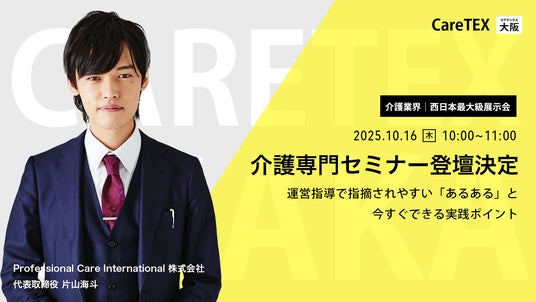 こうした現場の悩みに応えるべく、年間5,000人以上の医療・福祉事業者の経営者・管理者に研修を行い、数多くの運営指導対策を支援してきたProfessional Care International株式会社 代表取締役の片山海斗氏が、「運営指導対策セミナー」を実施します。舞台は、西日本最大級の医療・介護・福祉の商談展示会「CareTEX大阪’25」(主催:ブティックス株式会社)の専門セミナーです。