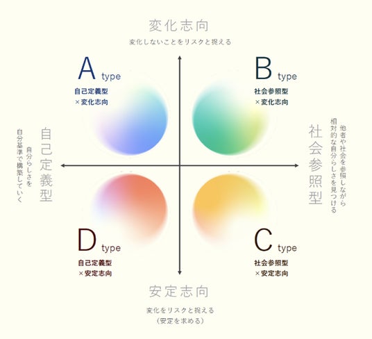 B type(社会参照型 × 変化志向)多様な人々との交流を重視し、家族や仕事を「協働体」として捉える。
