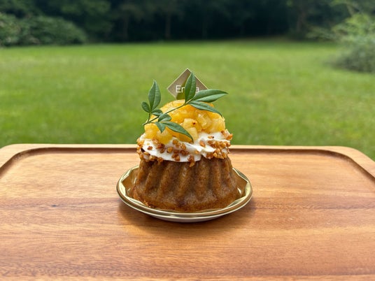 ゴーダリッチシフォン芳醇なゴーダチーズを練り込んだシフォンに、炙ることで香ばしさを増した柿を添えています。濃厚なチーズのコクと、果実のやわらかな甘みが溶け合います。