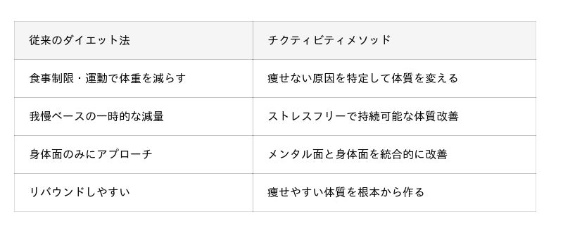 これに対し、チクティビテでは、これまでとは異なるアプローチで3,000人以上のダイエット成功を実現してきました。そのアプローチの最大の特徴が、「メンタル」へのアクセスです。