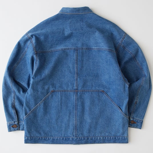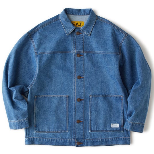 また、絶妙なショート丈で仕立てた、F.A.T.らしいワイドシルエットのデニムジャケット(12ozデニム)は、身幅・肩幅・アームまわりにゆとりを持たせた独自のカッティングでボリューム感のあるコーディネートやサイジングへのこだわりを際立たせます。フロントの2wayパッチポケットやバックポケットなど、機能性も追求した1着。こちらもFAT OSAKAだけのスペシャルモデルです。