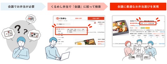 国内最大級の法人向け弁当デリバリーサービス「くるめし弁当」(運営:株式会社くるめし、本社:東京都渋谷区、代表取締役:小林 篤昌)は、新たにご利用いただくシーンに応じて最適なお弁当を検索できる機能の提供を開始しました。会議、懇親会、ロケなど、ご利用いただくシーンでお弁当の検索ができるようになったほか、選択したご利用シーンにおける各お弁当の評価を参考にしながらお弁当をお選びいただけるようになりました。今回の検索機能の追加により、さらなる「失敗しない」お弁当選びを後押しします。