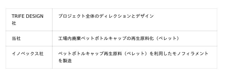 日本山村硝子株式会社(本社:兵庫県尼崎市、代表取締役 社長執行役員:山村 昇、以下 当社)は、株式会社 TRIFE DESIGN(本社:東京都中央区、代表取締役社長:小雀 新秀、以下 TRIFE DESIGN 社)および株式会社イノベックス(本社:東京都中央区、代表取締役 兼 執行役員社長:石原 智憲 以下 イノベックス社)との協業事業により、PETボトルキャップを原材料に使用したポリエチレン、およびポリプロピレン製の「モノフィラメント」(※1)を日本で初めて(※2)開発しました。