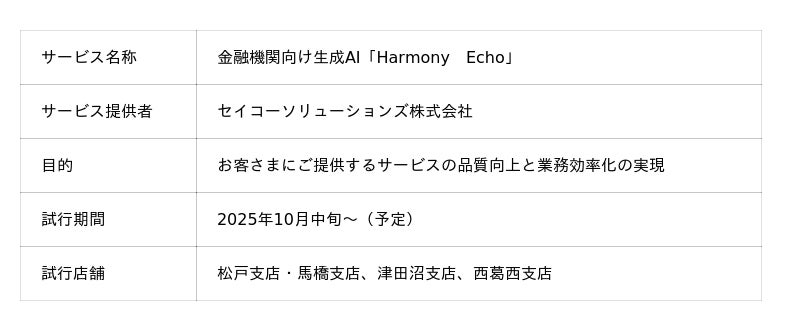 株式会社千葉興業銀行(頭取 梅田 仁司)は、セイコーソリューションズ株式会社(代表取締役社長 関根 淳)と協働し、お客さまにご提供するサービスの品質向上および業務効率化を目的とした、生成AI活用による面談記録作成業務の試行を本年10月より開始しますので、お知らせいたします。