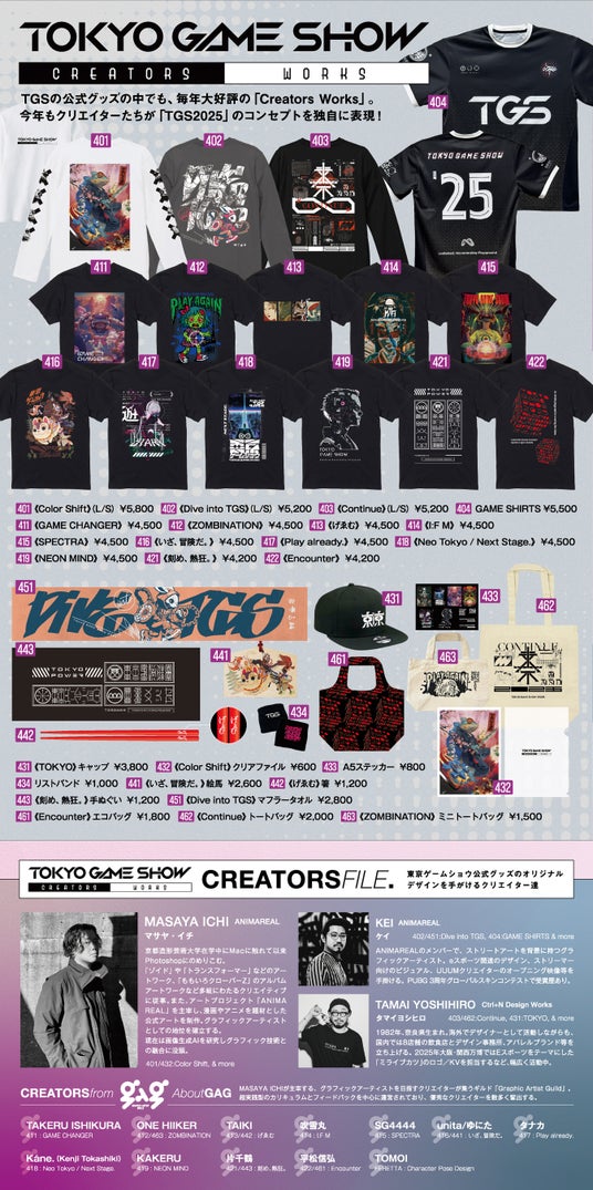 マサヤ・イチが運営するアートスクール「Graphic Artist Guild」では、在籍する生徒を対象にデザインの公募を実施しました。全100点以上の応募作品の中から選出されたデザインは、マサヤ・イチがプロデュースする公式グッズライン「TGS Creators Works」 として採用され、東京ゲームショウ2025の会期中に会場内で販売されます。 若手クリエイターの新たな感性が反映されたデザインは、ここでしか手に入らない限定アイテム。これまでの会期でも毎年完売を記録しており、今年も高い注目を集める人気アイテムとなることは間違いありません。
