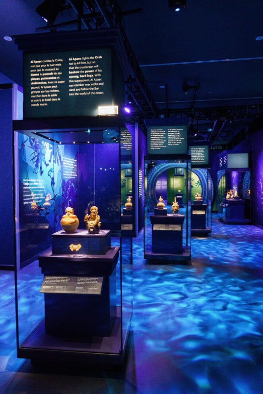 巨大スクリーンにはアンデスの大自然と天空都市マチュピチュが映し出されます。神話の英雄“アイ・アパエック”の登場とともに、展覧会全体のストーリーが幕を開けます。