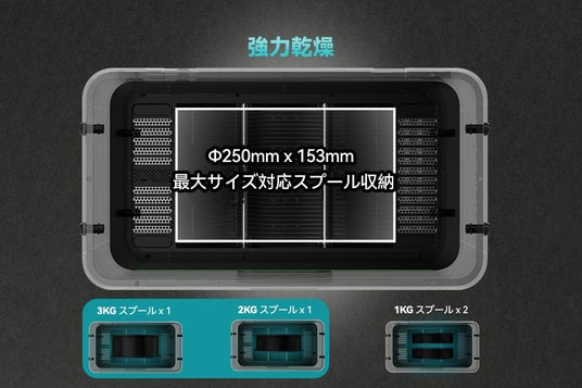 本製品は最大110℃対応、1kg×2巻または3kg巻対応の大容量設計、耐湿性素材の乾燥に対応するアニーリング機能搭載などを特長とし、これまでの乾燥機の常識を刷新する製品として位置付けています。