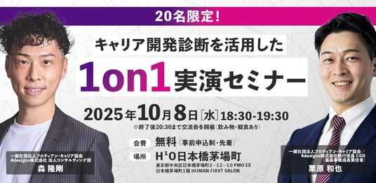 このたび、企業人事ご担当者様・HRBPを対象にした「キャリア開発診断を活用した1on1実演セミナー」を、2025年10月8日(水)に東京都中央区にて開催いたします。本セミナーは、前回開催時に大変ご好評をいただいたことを受け、追加開催が決定いたしました。