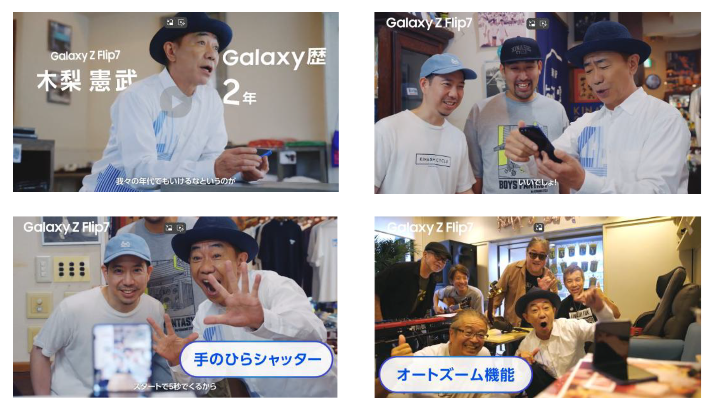 新WEB CM『Voices of Galaxy 木梨憲武篇 | Galaxy Z Flip7 | Samsung』を本日より公開いたします。CMでは、木梨さんのご実家である「木梨サイクル」、「なごみ堂」に立ち寄り、お客さんや店員と交流しながら、ご自身の「Samsung Galaxy Z Flip7」を自慢するシーンから始まります。「手のひらシャッター」や「オートズーム」機能を使って日常の一コマを撮影しながら、「Samsung Galaxy Z Flip7」が木梨さんの自然体な日常をとらえている様子を垣間見ることができます。木梨さんの自由でユーモアあふれるライフスタイルに寄り添う「Samsung Galaxy Z Flip7」が、日々の生活をより楽しく、より創造的にサポートする存在であることを伝えています。