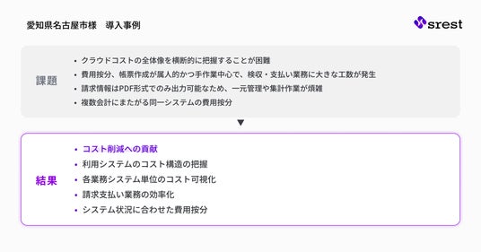 株式会社メタップスホールディングス(渋谷区、代表取締役社長 山崎祐一郎)が提供するAWSコスト管理ツール「srest(スレスト)」は、愛知県名古屋市での導入事例を2025年9月24日(木)より公開します。同市では、2025年3月に実証実験を実施し、同年6月に正式導入。運用開始から3ヶ月で業務効率化とAWSコストの削減に成功しました。本事例は、ガバメントクラウド環境におけるFinOps推進の先進的な取り組みとして、全国自治体におけるコスト最適化のモデルケースとなることを目指します。