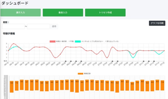 『キモチプラス』は、始業時にその日の気分や睡眠時間などを入力することで、日々の体調やメンタルの状態をグラフで見える化できるツールです。その日の行動アドバイスも受け取れるため、社員は体調に注意しながら働くことができます。
