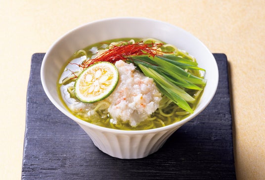 丸山千里氏が料理コンテストで絶賛された「お茶ラーメン」は抹茶の風味と鶏の清湯スープが絶妙にマッチする一杯。山椒をきかせた蟹の餡掛けを絡めます。麺を食べ終えたら、ご飯を入れて〆るのもおすすめです。