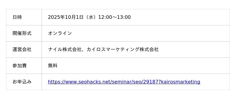 “次の一手”がデータでわかるMA+SFA一体型ツール「Kairos3(カイロススリー)」を提供するカイロスマーケティング株式会社(本社:東京都渋谷区、代表取締役:佐宗 大介、以下「当社」)は、ナイル株式会社との共催で、オンラインセミナー「『今すぐ客』を逃さず増やす!“即実践可能”なAI検索時代の商談創出プロセス」を2025年10月1日(水)に開催いたします。