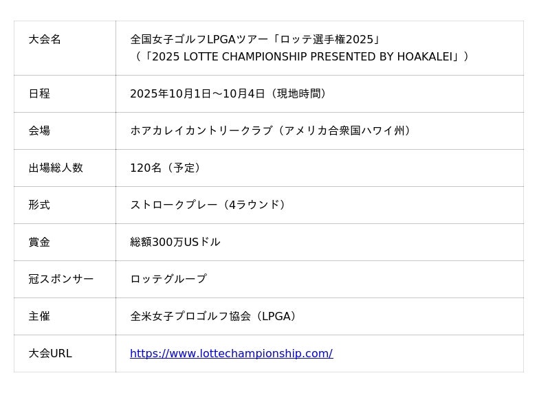ロッテグループは、2025年10月1日から10月4日(現地時間)の4日間、アメリカ合衆国ハワイ州ホアカレイカントリークラブにて開催される米国女子ゴルフ LPGAツアー「ロッテ選手権2025(2025 LOTTE CHAMPIONSHIP PRESENTED BY HOAKALEI)」において、13回目となる冠スポンサーを務めますのでお知らせいたします。