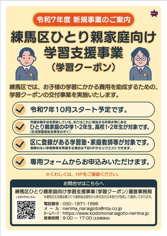 練馬区は、ひとり親家庭の学習の機会を確保するため、区に登録された学習塾や家庭教師などに利用できるクーポン方式による助成事業を10月1日(水)から開始します。