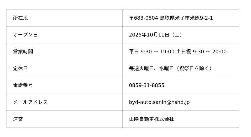 BYDの日本法人であるBYD Auto Japan 株式会社(本社:神奈川県横浜市、代表取締役社長:東福寺 厚樹、略称:BAJ)の正規ディーラーである山陽自動車株式会社(本社:鳥取県米子市、代表取締役社長:伊原 真治)は、2025年10月11日(土)に、全国で46店舗目、山陰地方では初となるショールームを備えた正規ディーラー店舗「BYD AUTO 山陰」をオープンします。