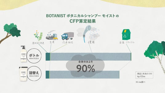 【1】 CFPについてBOTANISTがシャンプー1本の製造から使用・廃棄までの間におけるCO2排出量を 、同じ容量のボトルと詰替用で比較したところ、詰替用の方が少ないことが判明しました。さらに、製造時や輸送時よりも自宅での使用によるCO2排出量が多く、全体の9割を占めることも分かりました。