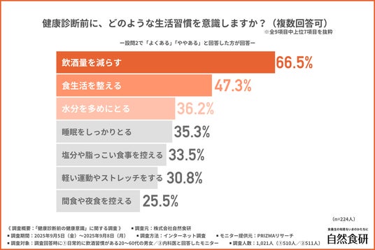「健康診断前に、どのような生活習慣を意識するか」について尋ねたところ、『飲酒量を減らす(66.5%)』が最多で、『食生活を整える(47.3%)』『水分を多めにとる(36.2%)』となりました。