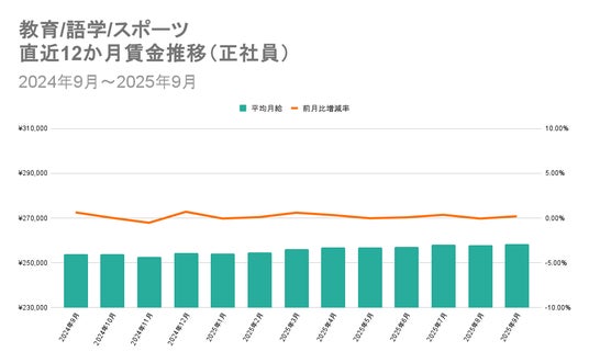 1位の「教育/語学/スポーツ」と17位の「映像/イベント/芸能/キャンペーン」における直近の月給推移を比較すると、「教育/語学/スポーツ」では2024年11月に一旦下落したものの、その後はゆるやかな上昇傾向を維持しています。