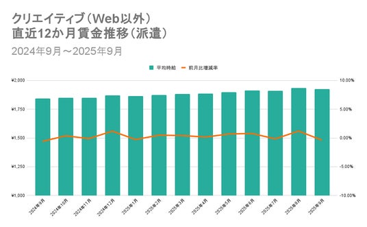 1位の「ファッション/アパレル/インテリア」と11位の「クリエイティブ(Web以外)」における直近の時給推移を比較すると、「ファッション/アパレル/インテリア」の平均時給では2025年8月から同年9月にかけて、アパレル業界を中心とした人材サービスを提供する株式会社iDAと株式会社スタッフブリッジが、時給1,600円台のアパレルスタッフ求人を出稿した影響で上昇しました。