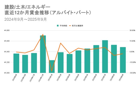 1位の「ファッション/アパレル/インテリア」と13位の「建設/土木/エネルギー」における直近12か月の賃金推移を比較すると、「ファッション/アパレル/インテリア」では2024年9月から10月にかけて上昇した後、一旦下落しましたが、2025年1月に大きく上昇し、その後は比較的安定した推移を維持しています。