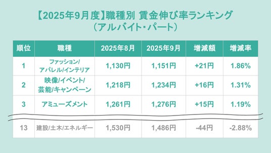 アルバイト・パートの職種別賃金伸び率ランキング(前月比)トップ3は、1位が「ファッション/アパレル/インテリア」(増加額+21円、増加率+1.86%)、2位が「映像/イベント/芸能/キャンペーン」(増加額+16円、増加率+1.31%)、3位が「アミューズメント」(増加額+15円、増加率+1.19%)でした。