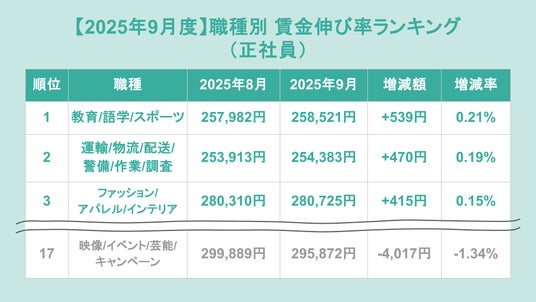 正社員の職種別賃金伸び率ランキング(前月比)トップ3は、1位が「教育/語学/スポーツ」(増加額+539円、増加率+0.21%)、2位が「運輸/物流/配送/警備/作業/調査」(増加額+470円、増加率+0.19%)、3位が「ファッション/アパレル/インテリア」(増加額+415円、増加率+0.15%)でした。