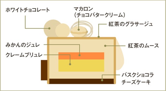 アールグレイとダージリンの2種類の紅茶のムースがふわりと溶け、柑橘の香りをまとったなめらかなクレームブリュレとともにみかんジュレの食感のハーモニーをお楽しみください。