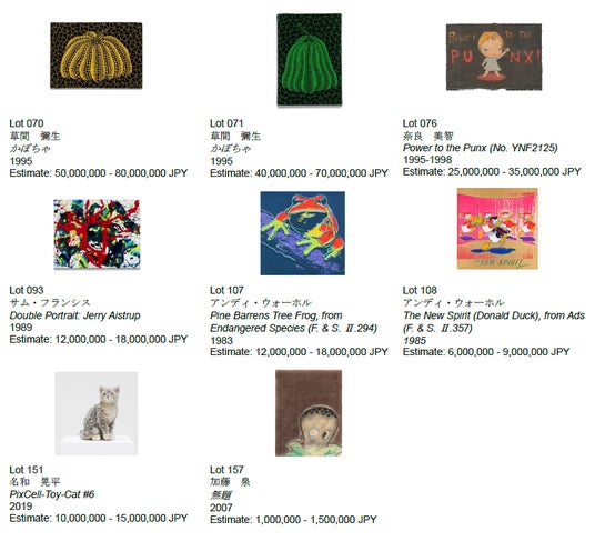 それぞれの作家にとって、キャリアの節目を示す重要な作品が揃い、時代やジャンルを超えて対話するような奥行きをもつラインアップとなります。芸術の秋にふさわしい本オークションを通じて、現代アートの豊かな世界と作家たちの軌跡に触れていただければ幸いです。