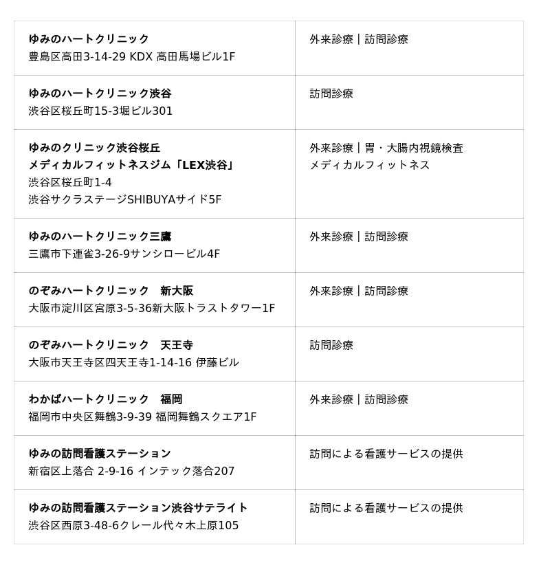 「医を通してその人らしい人生をサポートする」という理念のもと、地域での外来診療と在宅医療(訪問診療、訪問看護、訪問リハビリテーション、訪問栄養指導)を行っています。2012年9月ゆみのハートクリニック(高田馬場)を開院。現在、東京・大阪・福岡に7拠点を展開しております。