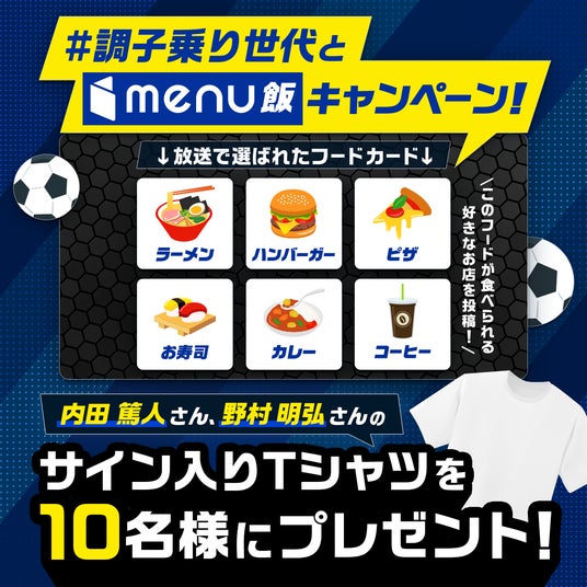 また、本特別回は放送250回への感謝を込めて、DAZNにて全編無料で配信。加えて、内田篤人さん&野村明弘さんのサイン入りTシャツが抽選で10名様に当たるSNS連動キャンペーン「#調子乗り世代とmenu飯 キャンペーン」を実施します。番組とあわせてぜひお楽しみください。