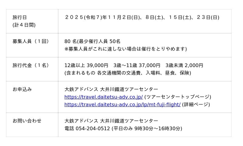 大井川鐵道(株)のグループ会社でバス事業・旅行業事業を展開する(株)大鉄アドバンス、(株)フジドリームエアラインズ、富士山静岡空港(株)が2018年から三社連携で行っている「富士山遊覧フライトツアー」のご案内です。