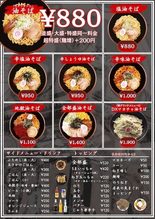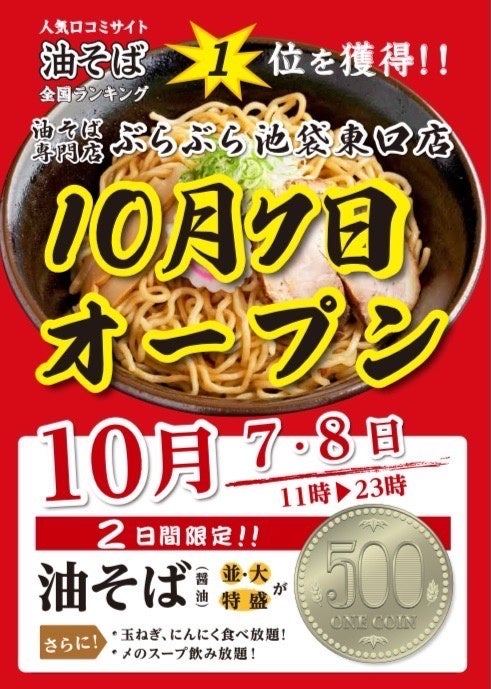 オープンを記念し、10月7日(火)・8日(水)限定で特別キャンペーンを実施します。期間中は、看板メニューの「油そば(醤油)」を、特盛(300g)まで一律500円(税込)でご提供いたします。