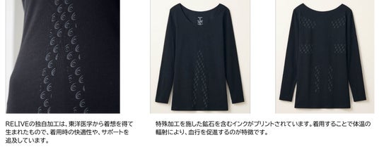 株式会社りらいぶが展開する「リライブウェア」は遠赤外線を輻射し、着用するだけで血行を促進します。また、特殊な加工を施した複数の鉱石を練りこんだインクがウェアにプリントされています。パフォーマンスをサポートするだけではなく、日常的に取り入れていただくことで、忙しい毎日をイキイキと楽に過ごすことができます。※4