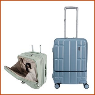 取り外せるダブルキャスターは簡単に交換ができ、丸洗い可能。移動中に荷物の出し入れやPC収納も可能なフロントオープン収納付きです。
