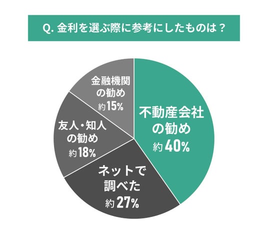 金利タイプを選ぶ際の参考情報として、不動産会社の勧めが最も多く挙げられました。これは、中古マンション購入時に不動産会社が重要な情報提供者としての役割を果たしていることを示しています。一方で、インターネットで自ら情報収集する人も4分の1を超えており、情報収集の多様化が見られます。