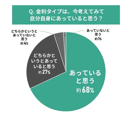 現在の金利タイプ選択について、約96%の人が「あっている」と回答しています。この高い満足度は、多くの購入者が自身の状況に適した金利タイプを選択できていることを示しています。完全に不満を感じている人はわずか約1%にとどまっており、金利選択の成功率の高さがうかがえます。