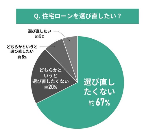 住宅ローンの選び直しについては、約87%の人が「選び直したくない」と回答しています。これは現在の金利タイプに対する高い満足度と整合性のある結果です。積極的に選び直しを希望する人は約12%にとどまっており、多くの人が現在の選択に満足していることがうかがえます。