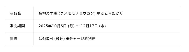 チョーヤ梅酒株式会社 (本社:大阪府羽曳野市、社長:金銅重弘、以下チョーヤ) は、梅酒カクテル専門店「The CHOYA 銀座BAR (ザ チョーヤ ギンザバー) 」の初の和菓子として開発した、星舞う夜空をイメージした梅と桃の羊羹に、輝く満月をイメージした完熟南高梅の甘露煮を1粒添えた「梅桃乃羊羹 (ウメモモノヨウカン) 星空と月あかり」を10月6日 (月) から12月17日 (水) まで期間限定で発売いたします。オリオン座流星群やおうし座流星群に象徴される秋の星空と、中秋の名月やお月見といった季節の風物詩として親しまれる満月のイメージを掛け合わせました。月の光が強まるほど星々の輝きが霞んでしまう、そんな秋の夜空に浮かぶ、相反する美しさと儚さを一皿の和菓子で表現しました。