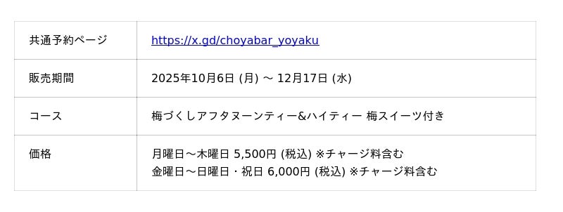 梅酒カクテルやノンアルコール梅カクテルなど100種類以上のドリンクが飲み放題!梅づくしアフタヌーンティーに新プラン!(予約URL : https://x.gd/choyabar_yoyaku )