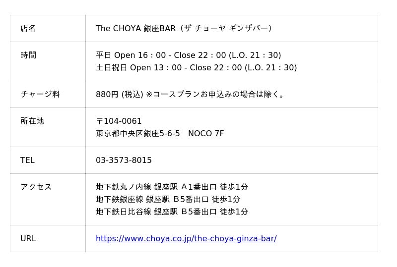 The CHOYA 銀座BARでは、お客様に「常に梅との新しい出会い」をお届けする事をコンセプトにこれからも運営して参ります。梅気分の際には、お気軽にお立ち寄りください。