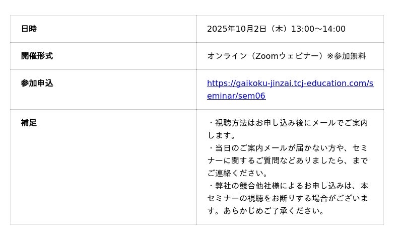 総合日本語教育機関の株式会社TCJグローバル(本社:東京都新宿区、代表取締役社長:中澤 匠)は、外食業界での外国人材活用に関心をお持ちの方向けに、無料共催ウェビナー「外食の人手不足を解決!外国人材活用ウェビナー」(PRONTO × TCJ)を2025年10月2日(木)13:00~14:00に開催いたします。