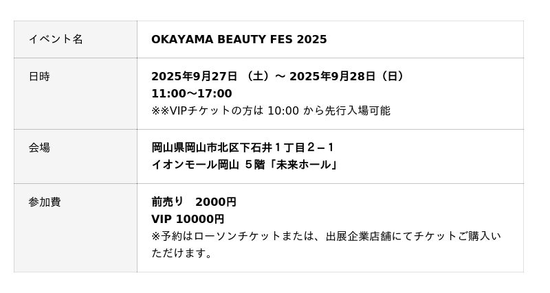 【OKAYAMA BEAUTY FES 2025】は、コスメ・エステ・ヘルスケア・フィットネス・フードなど、 幅広いジャンルのブースが一堂に会する、岡山最大級の美容イベントです。