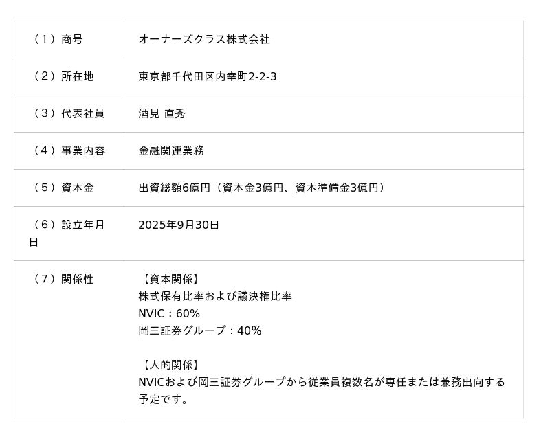 農林中央金庫グループの投資運用・助言会社である農林中金バリューインベストメンツ株式会社(代表者:代表取締役社長 酒見 直秀、以下「NVIC」)と株式会社岡三証券グループ(代表者:取締役社長 新芝 宏之、以下「岡三証券グループ」)(以下「両社」)は、下記のとおり、2025年9月30日に合弁会社「オーナーズクラス株式会社」を設立することを決定しましたので、お知らせいたします。