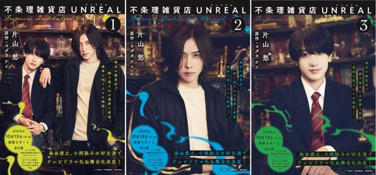 『不条理雑貨店 UNREAL』1~3巻の重版が決定しました。ドラマ&舞台化決定を記念し、主演俳優のビジュアルを使用した実写化記念全面帯カバーつきで、2025年9月下旬より、全国の書店で販売されます。